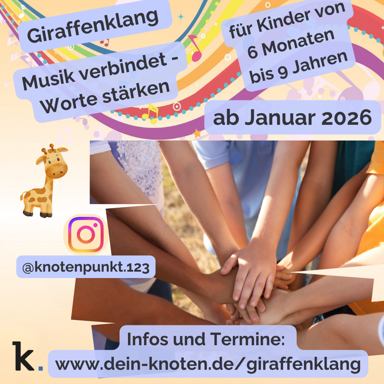 Giraffenklang ist mehr als ein Musikkurs. Es ist ein Raum, in dem Kinder wachsen dürfen. Mit Musik, Bewegung und achtsamer Kommunikation begleiten wir sie dabei, ihre Gefühle, ihre Stimme und ihre Stärke zu entdecken und zu lernen: