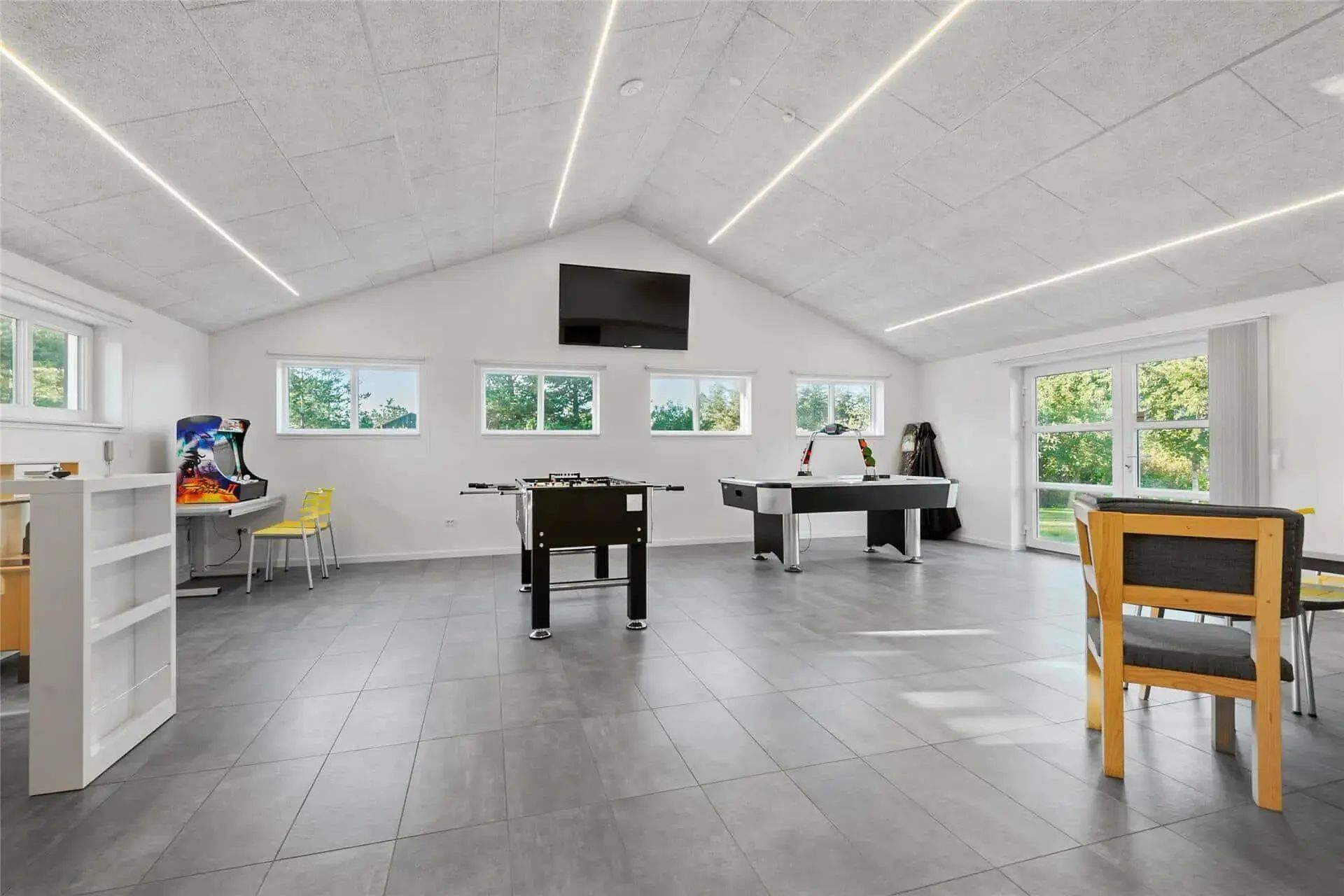 Das Ferienhaus bietet drei verschiedene Aufenthaltsräume – einen Raum in offener Verbindung mit der Küche, in dem man sich an den großen Esstischen mit Gesellschaftsspielen vergnügen kann, ein Wohnzimmer mit zwei Sofagruppen und mehreren Rückzugsecken. Dazu kommt ein Aktivitätsraum mit Tischfußball, Sauna und weiterem.